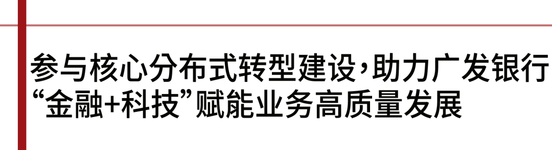 广发银行启动核心系统分布式转型,分步有助于主机下移,加速数字化转型步伐,为构建开放金融服务生态奠定基础。广发银行作为全国性股份制商业银行中的科技排头兵,不断走在金融科技探索与实践的前列,以“金融+科技”赋能网点、运营、业务、产品等各方面的数字化创新转型。在统筹开展与安全的大背景下,广发银行围绕“自有技术、自有平台、自有队伍”的转型目标,不断加大对自主技术平台体系建设。