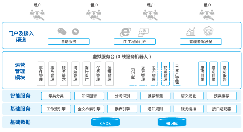 凯发k8国际信息智能流程自动化运营管理平台,在服务管理过程中嵌入人工智能和自动化技术,顺利获得独特的“虚拟服务台”,实现智能工单分类、告警模式识别、根因分析、智能问答、热点分析、自助化交付等多项功能,建立新一代IT 智能运营管理平台,提高服务交付效率和敏捷性,增强客户满意度,助力金融数字化转型落地。